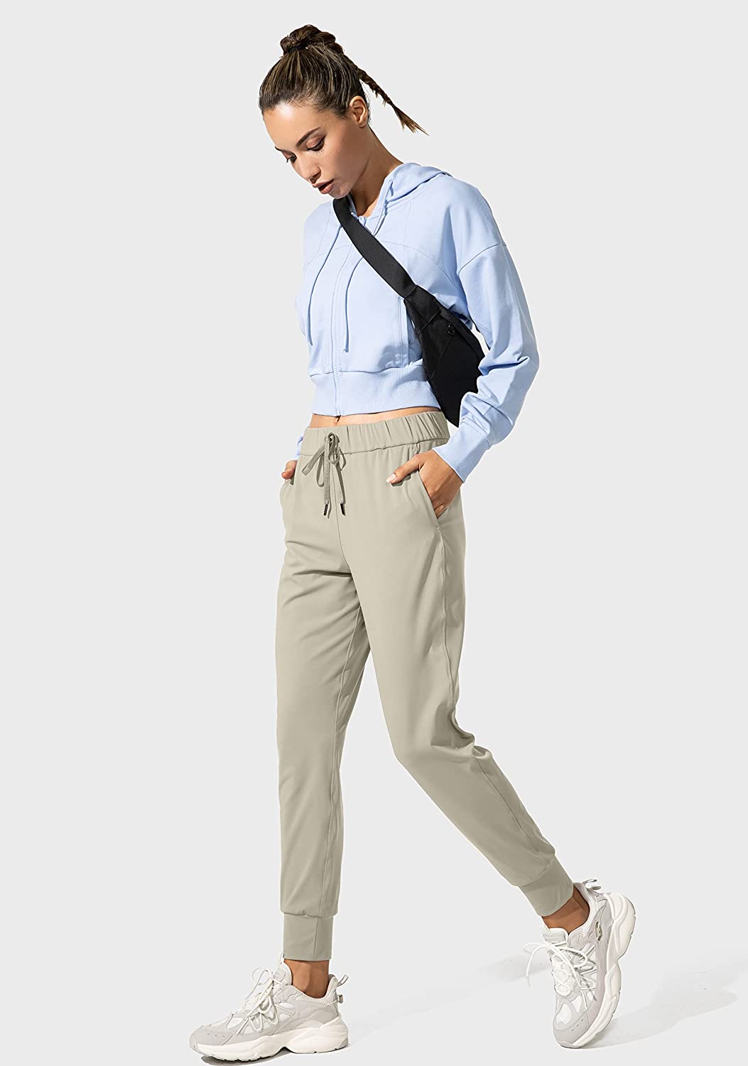 - Fabric: 75% Nylon / 25% spandex. Zeeglow women’s joggers pants made of Soft, comfortable and four-way stretch fabric provide you with maximum comfort, support and coverage in your workout.